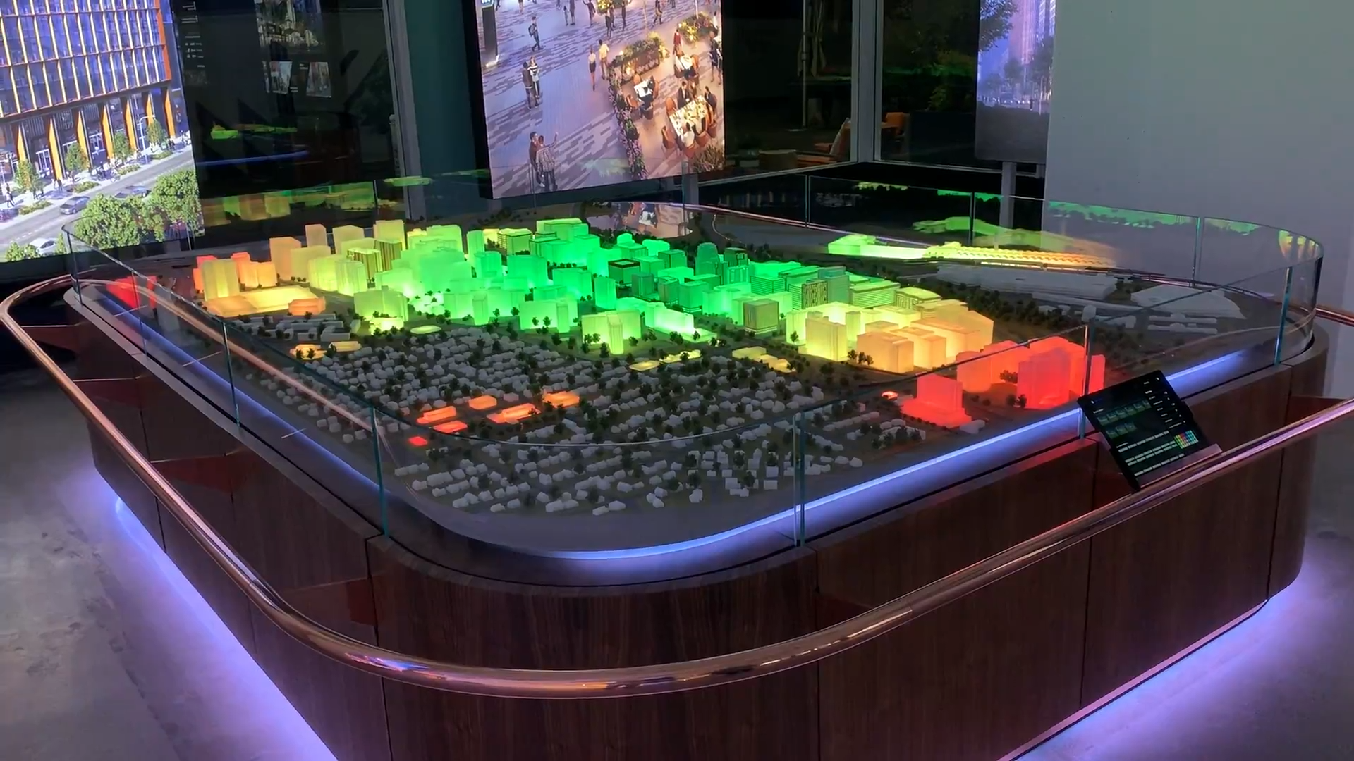 Supplementing the architectural display, a tablet allows presenters to select and alter the colors of individual buildings as well as groups. This gives clients an accurate and beautiful sense of scale for owned properties and future developments. When not in use, the tablet can be set to 1 of 3 screensaver modes that animate the display.
